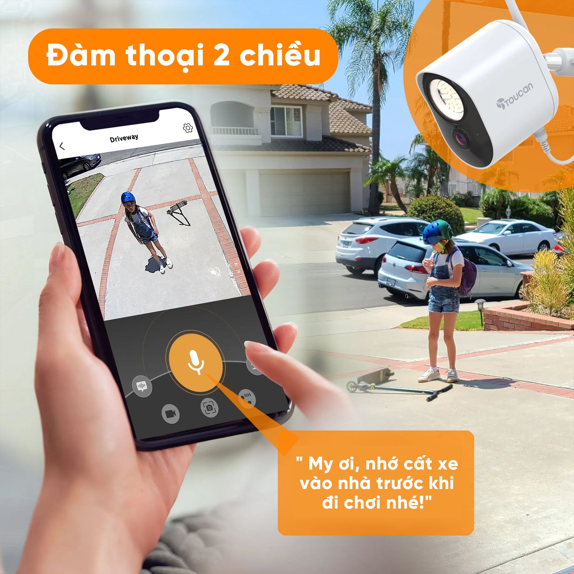 Điều khiển Camera qua ứng dụng Toucan Smart Home để đàm thoại 2 chiều hay tính năng tin nhắn thoại có sẵn đề nói chuyện với người trong gia đình. Có thể tùy chỉnh khu vực phát hiện chuyển động, báo động cùng hệ thống còi báo 110bB và đèn LED kết hợp